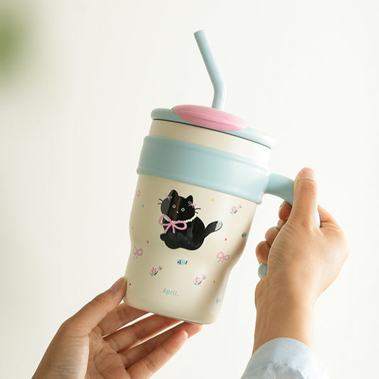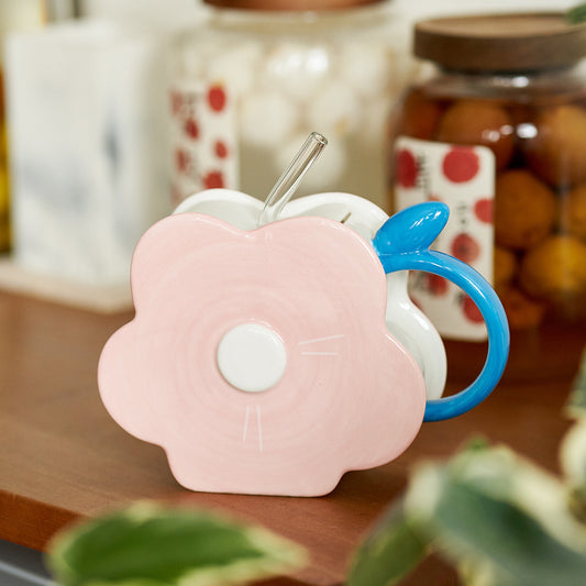 Original Flower-shaped Ceramic Mug with Lid and Straw