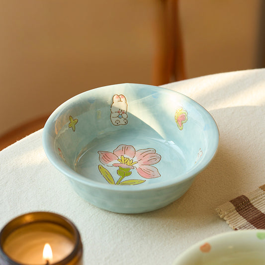 Hand-painting Style Ceramic Salad Plate with Cat Rabbit Pattern